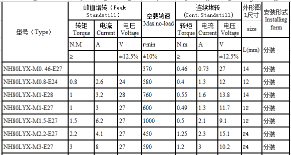 NH80LYX series brushless torque motor performance indicators